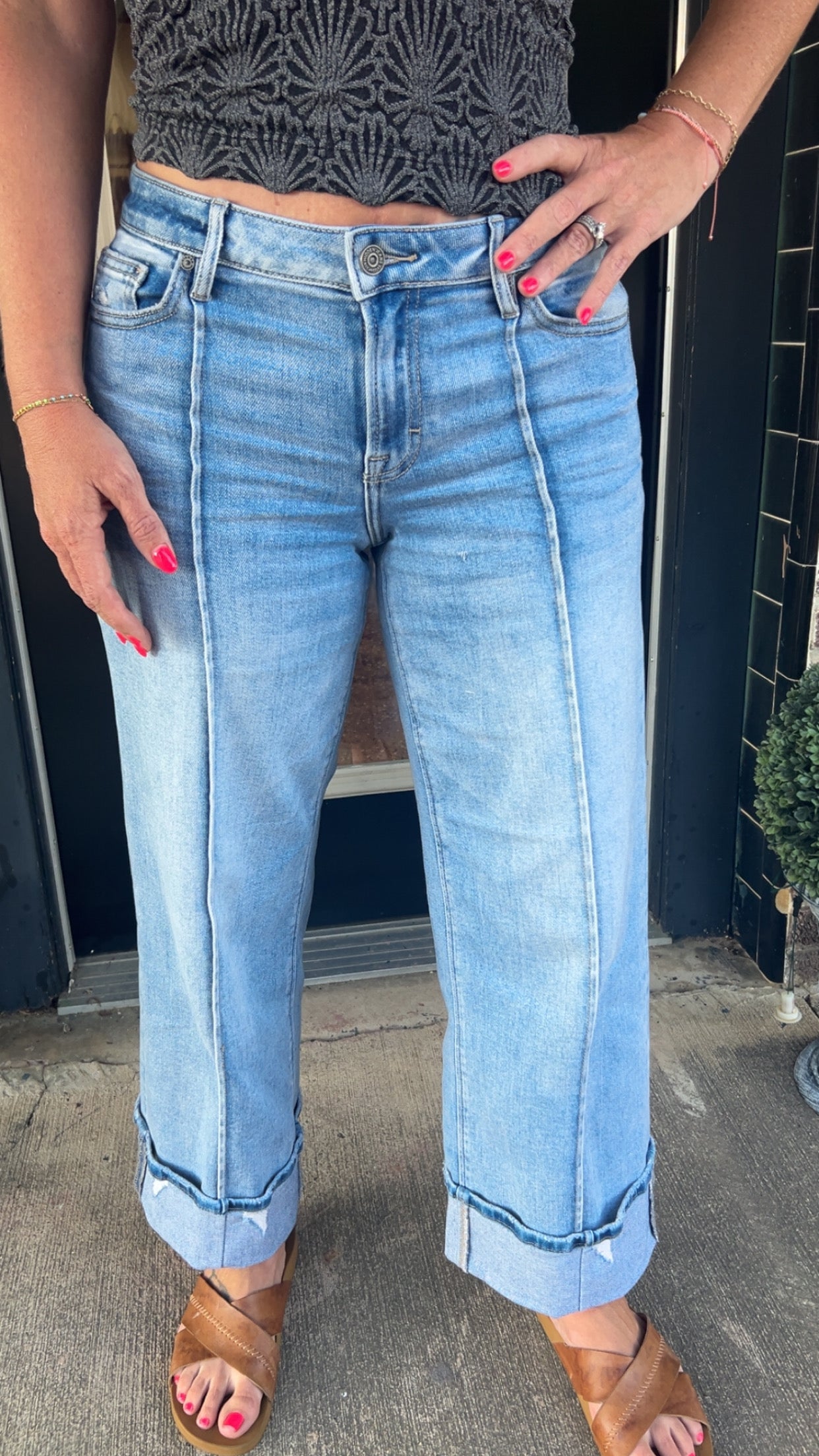 A modern take on laid-back denim, these Hidden brand wide-leg jeans feature a relaxed high-rise fit with a crisp front seam and exaggerated cuffed hem. The light wash adds a sun-faded charm, while the structured leg and bold cuff bring effortless polish. Finished with clean back pockets and subtle whiskering, these jeans are perfect for pairing with tanks or cropped tops for an elevated casual look.