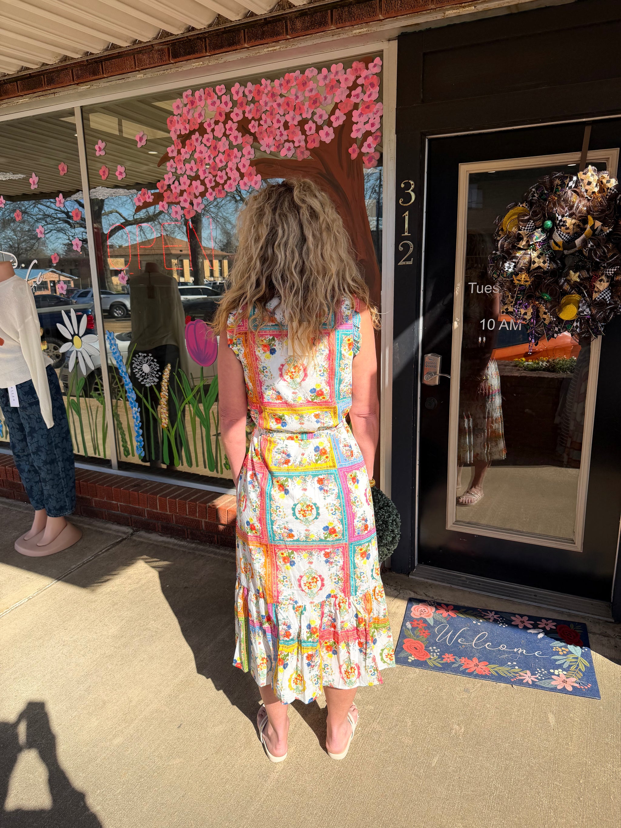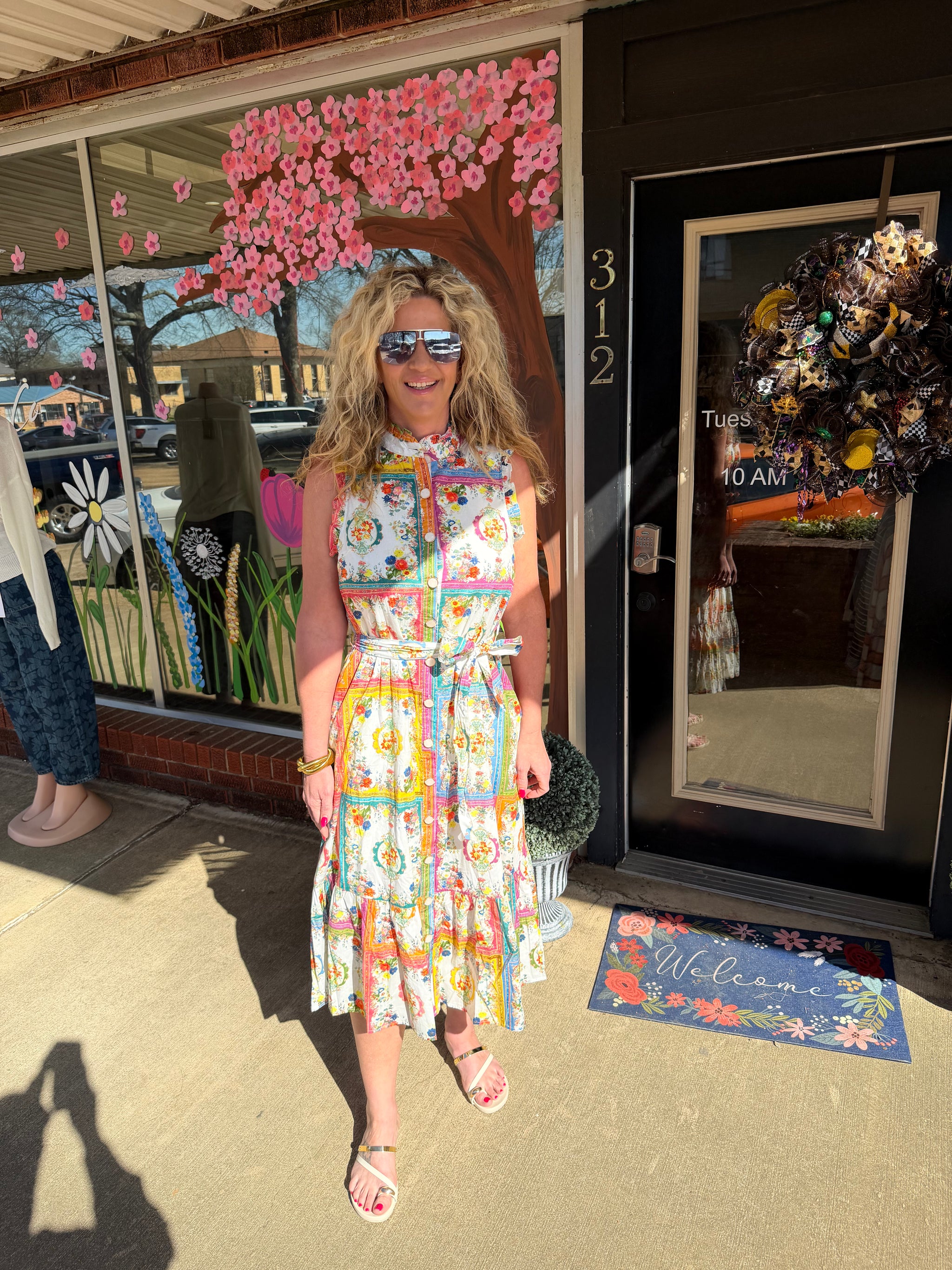 Fresh, feminine, and effortlessly chic — the Garden Market Patchwork Floral Midi Dress features a flattering button-front design, colorful vintage-inspired floral print, and a waist-defining tie belt. This lightweight boutique floral midi dress is perfect for spring events, brunch, vacations, and everyday summer style. A timeless statement piece for any wardrobe.
