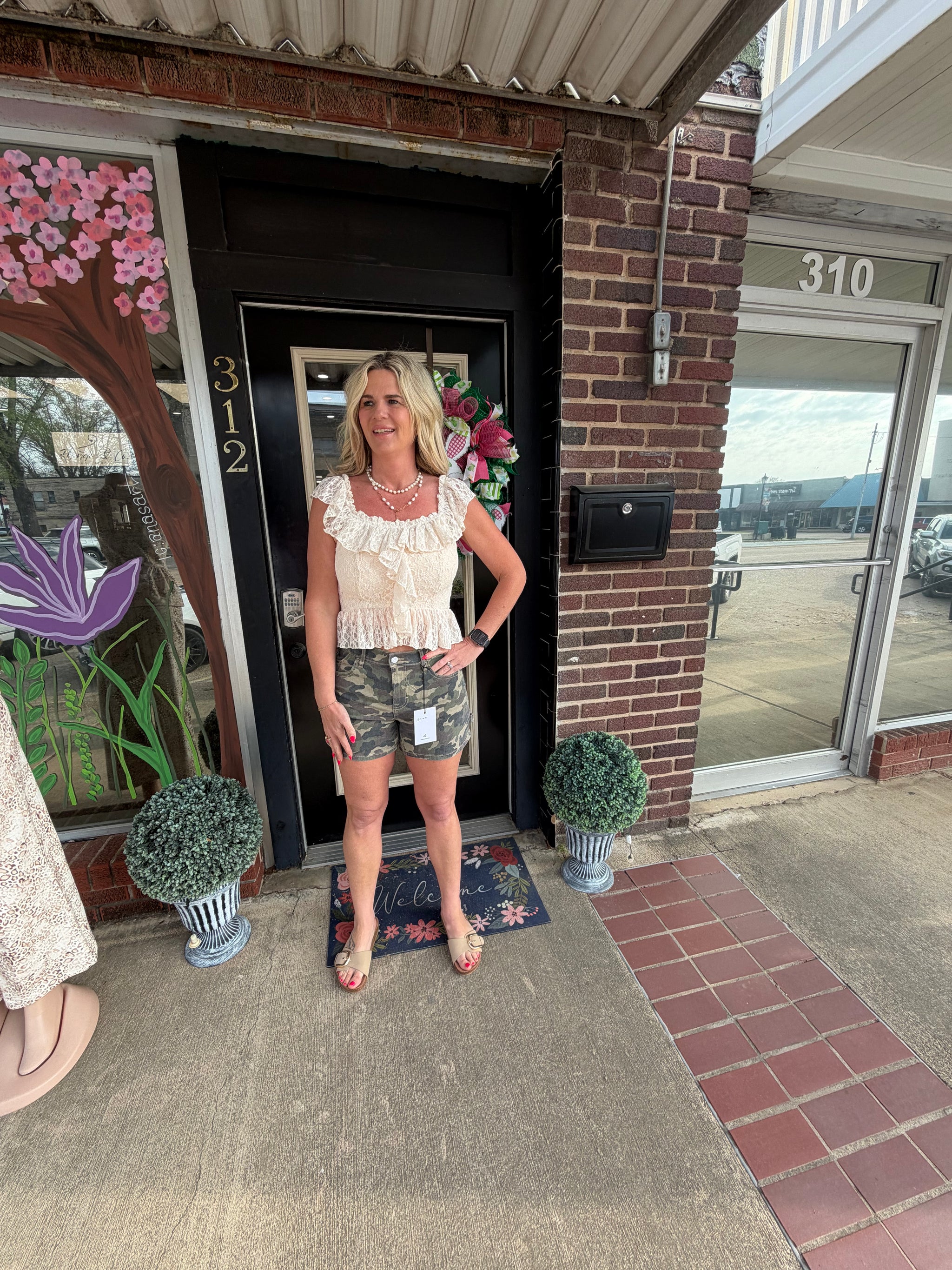 Hidden Logan camo denim shorts with high rise fit and 5” inseam. Soft, flattering and perfect for casual everyday summer outfits.
