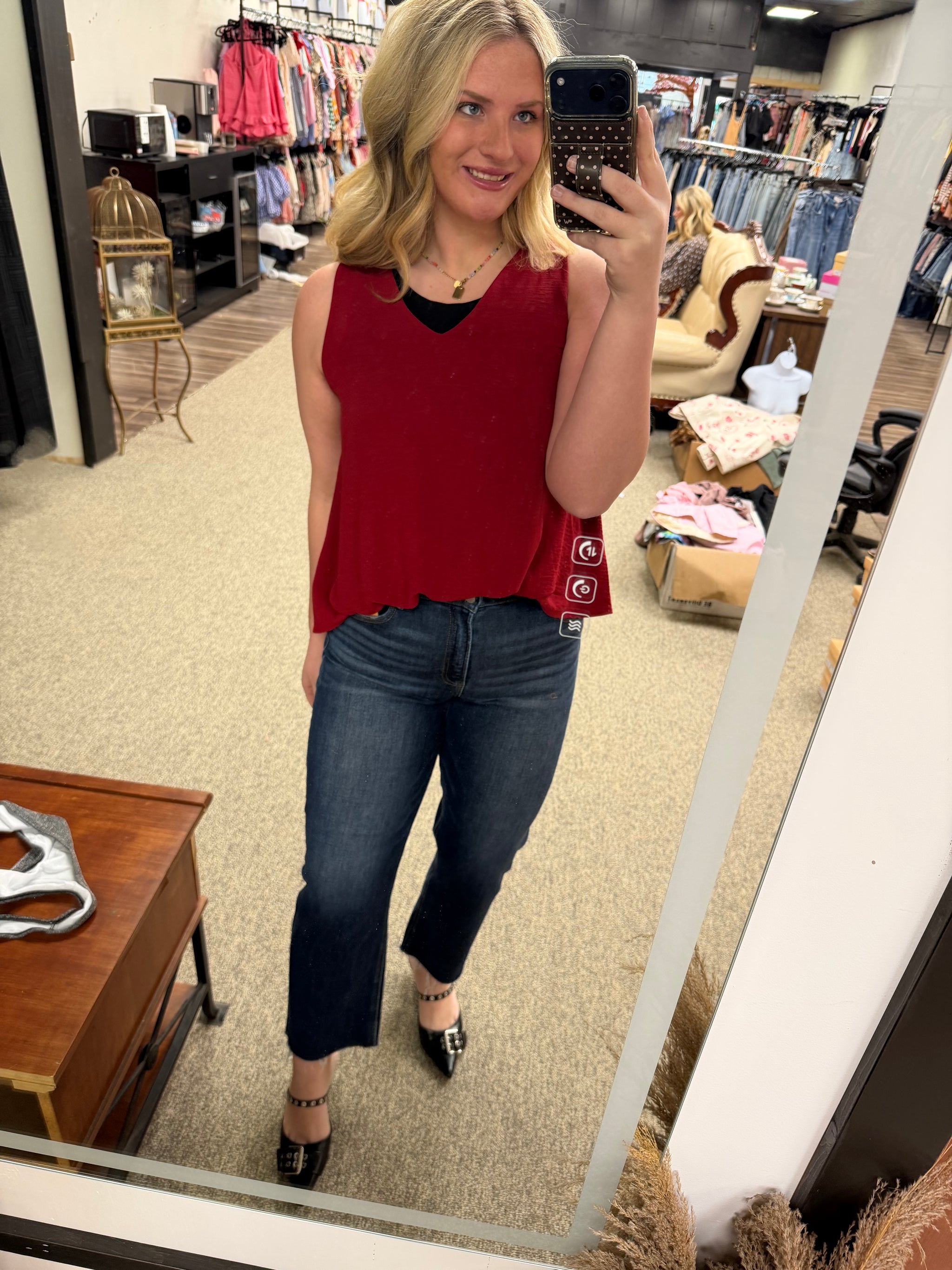 Chic red bubble hem top with a flattering high-low silhouette. Lightweight, flowy, and perfect for everyday wear or dressing up—effortless boutique style