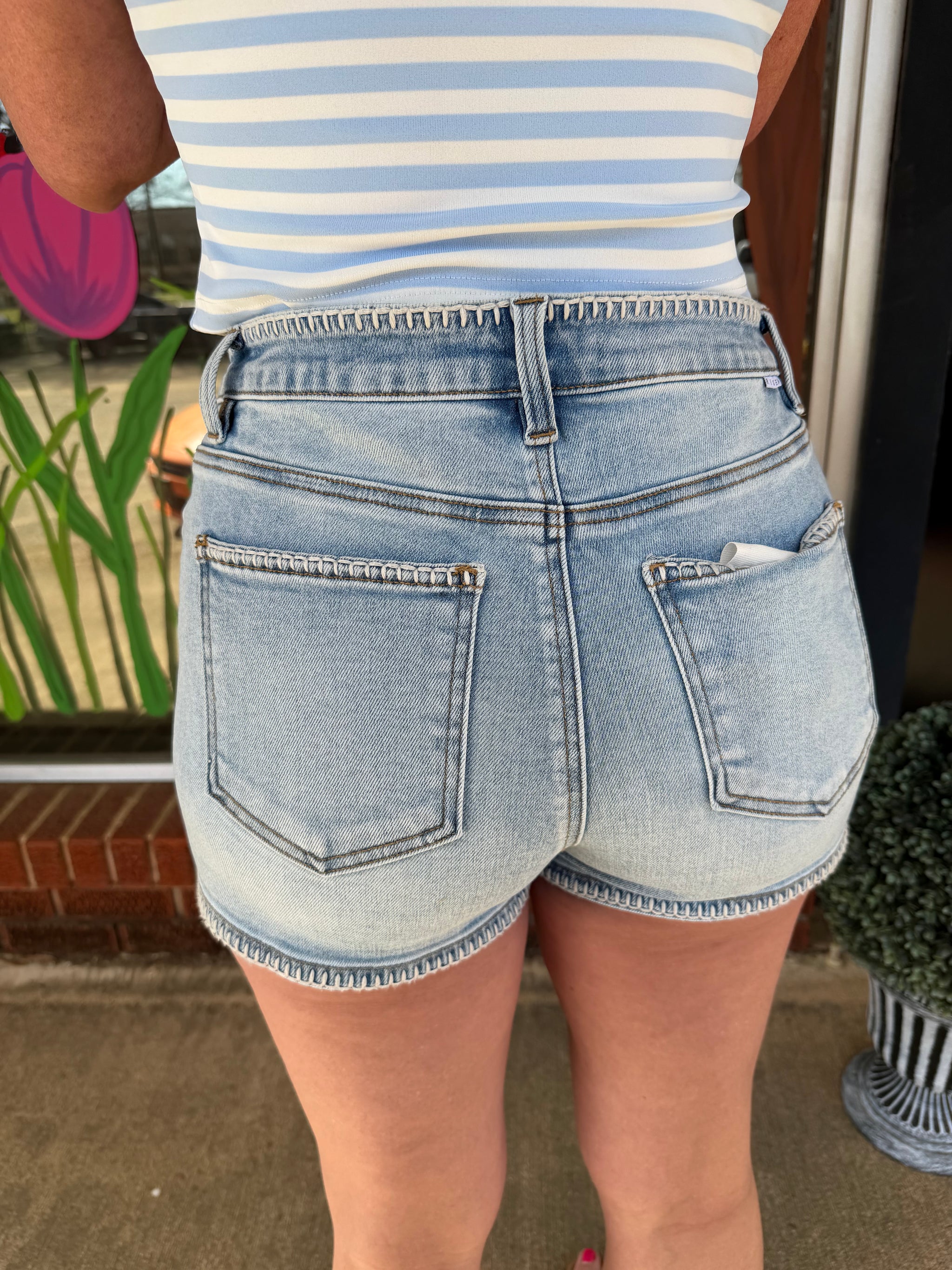 Light wash Risen high-rise denim shorts with unique whipstitch trim detailing and a flattering fitted silhouette. These boutique denim shorts feature a soft stretch denim, vintage light wash, and high-waisted fit that pairs perfectly with tanks, graphic tees, and summer sandals. Trendy women’s light wash denim shorts with whipstitch trim are a must-have for effortless summer outfits, casual everyday style, vacations, and boutique fashion lovers.
