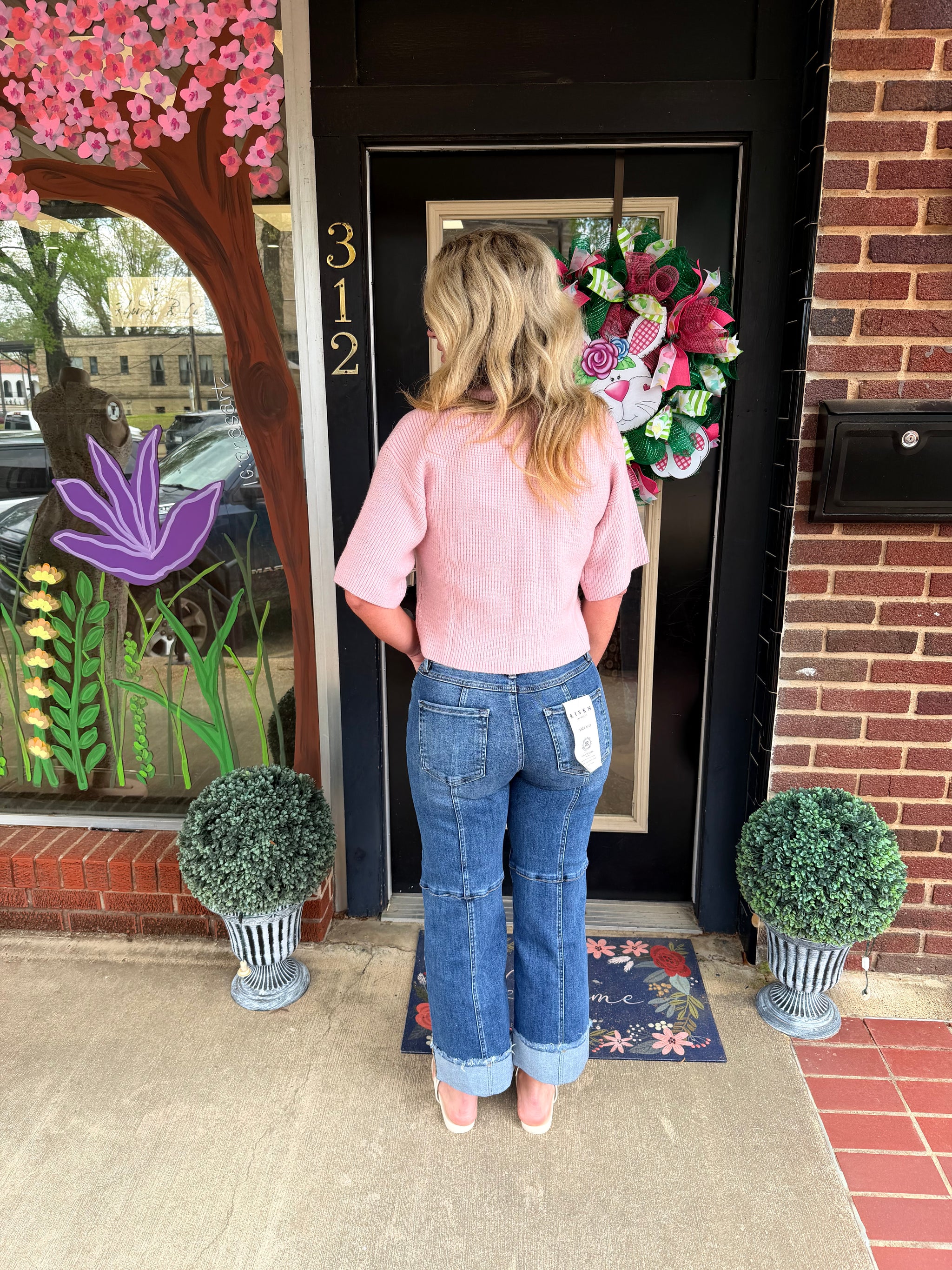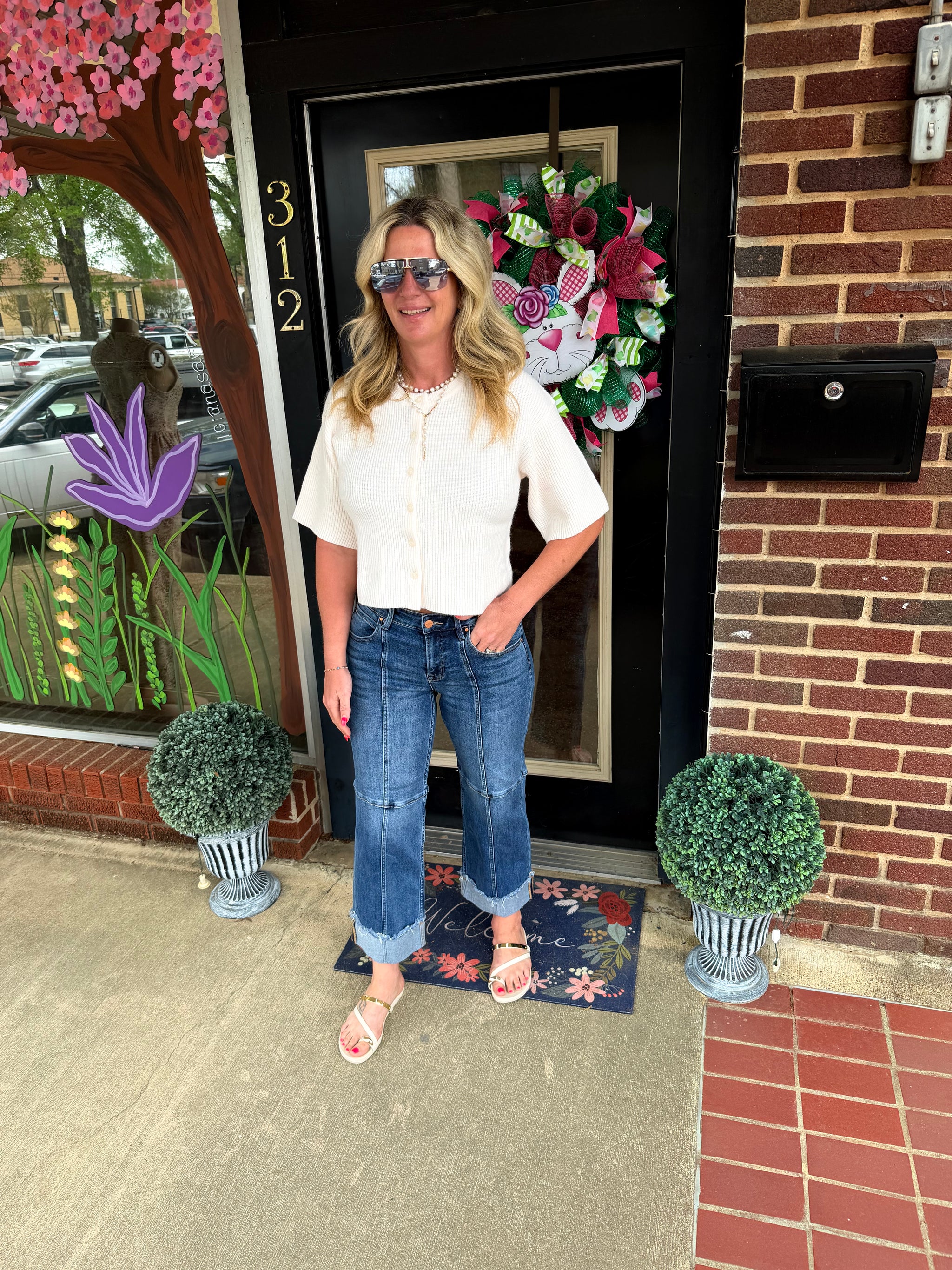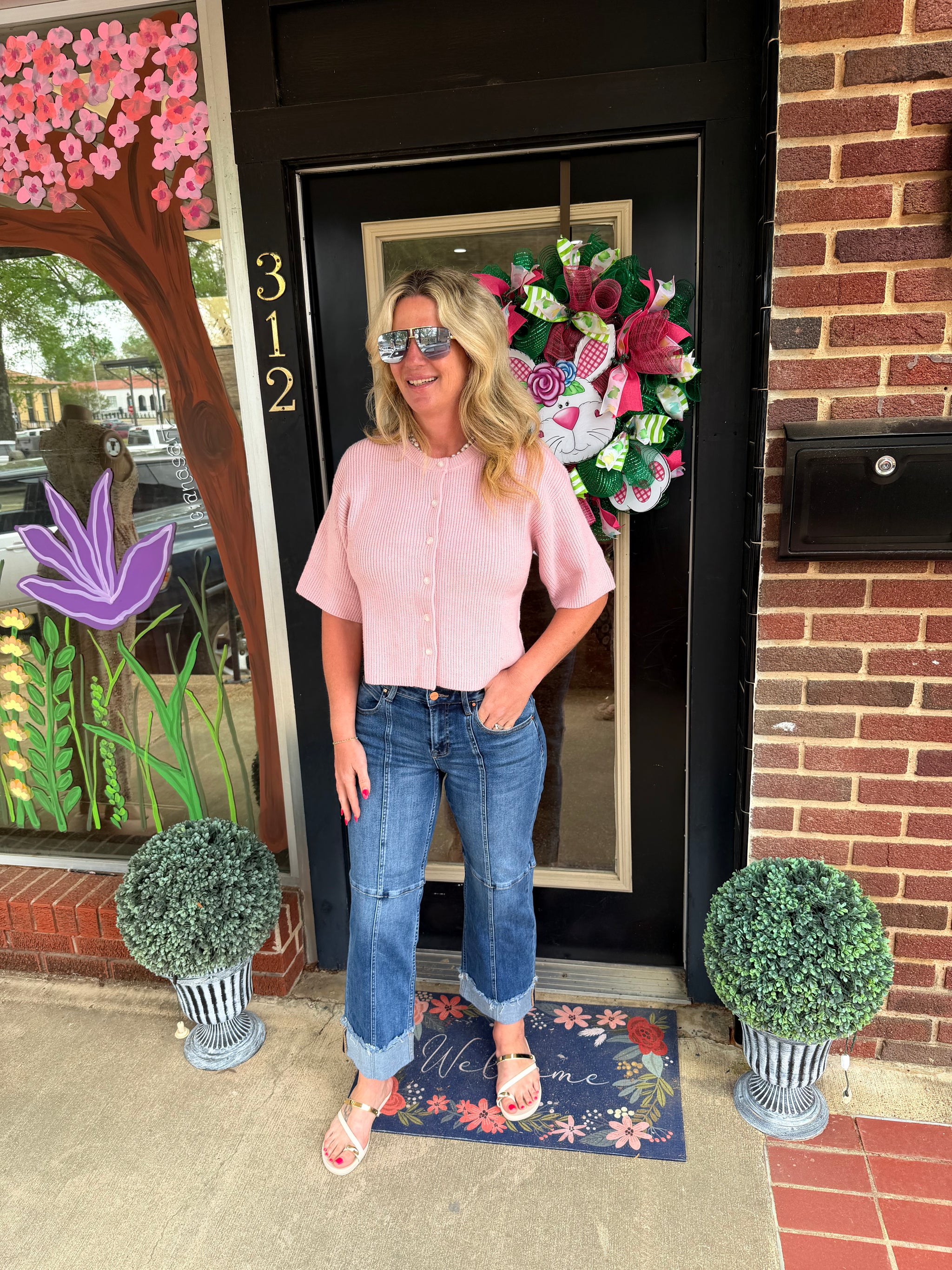 Lightweight short sleeve knit cardigan with button front. Soft, cropped fit perfect for layering. Available in blue, cream, and pink. Everyday boutique favorite.