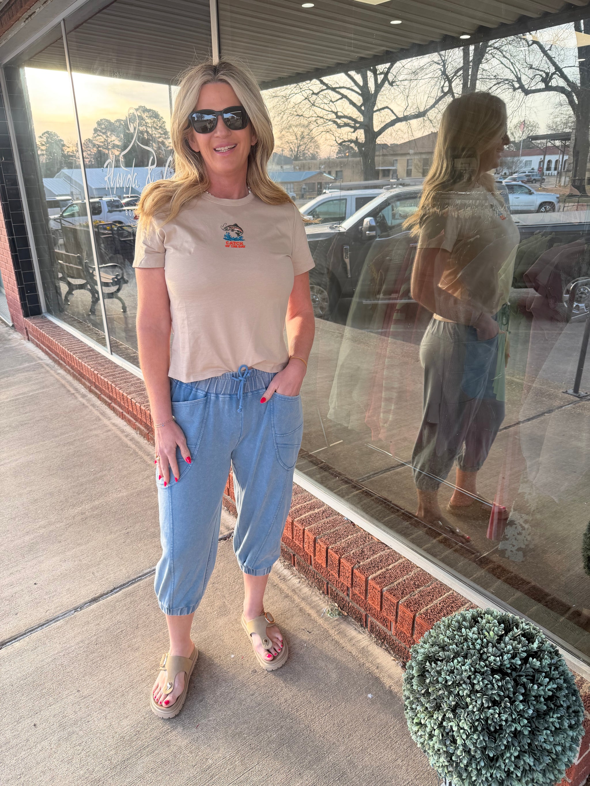 Shop our slate blue drawstring joggers featuring a relaxed fit, soft lightweight fabric, elastic waistband, and cuffed hem. These comfy everyday lounge pants are perfect for casual outfits, travel days, running errands, or athleisure styling. Easy to pair with graphic tees, tanks, and sandals for effortless boutique style.